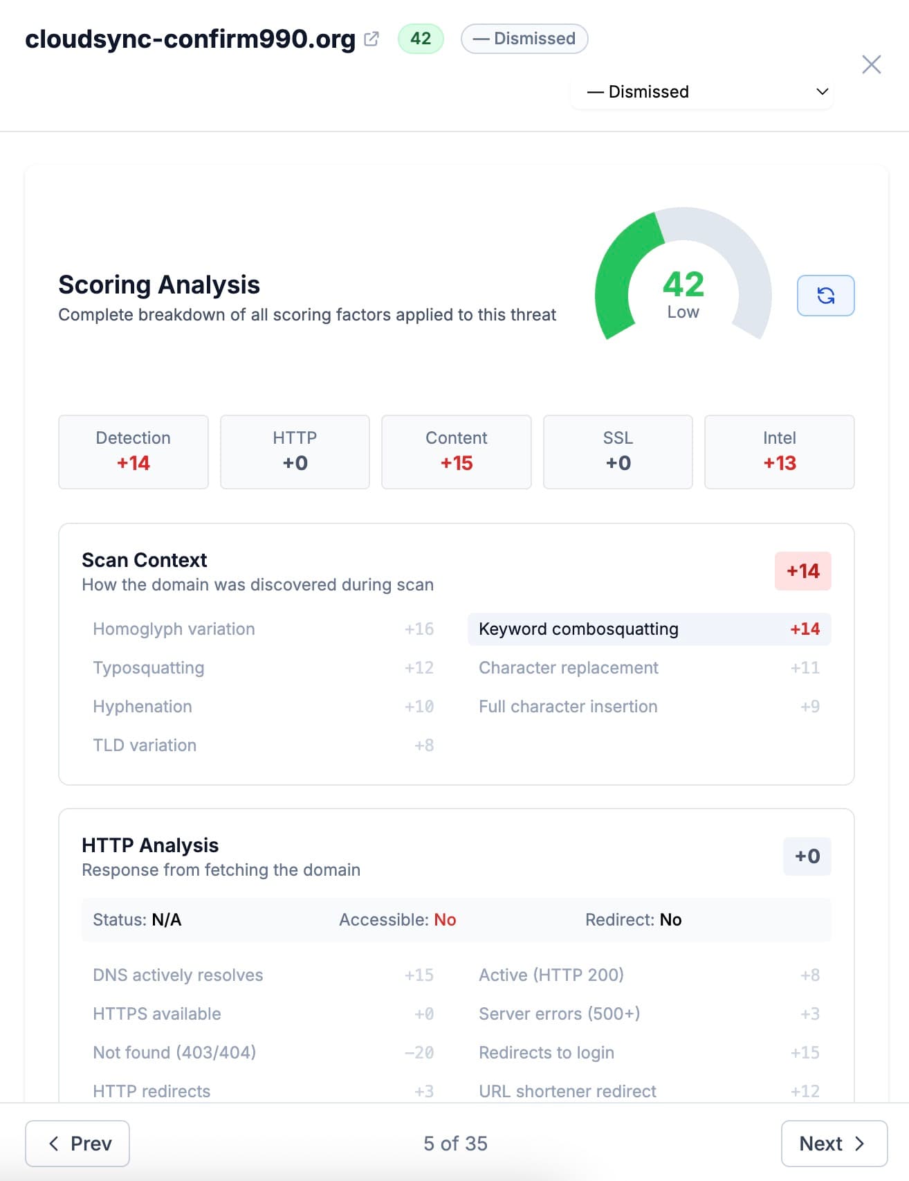 Dozens of factors analyze each threat including SSL certificates, WHOIS data, and content analysis. Auto-classification saves hours of manual review.