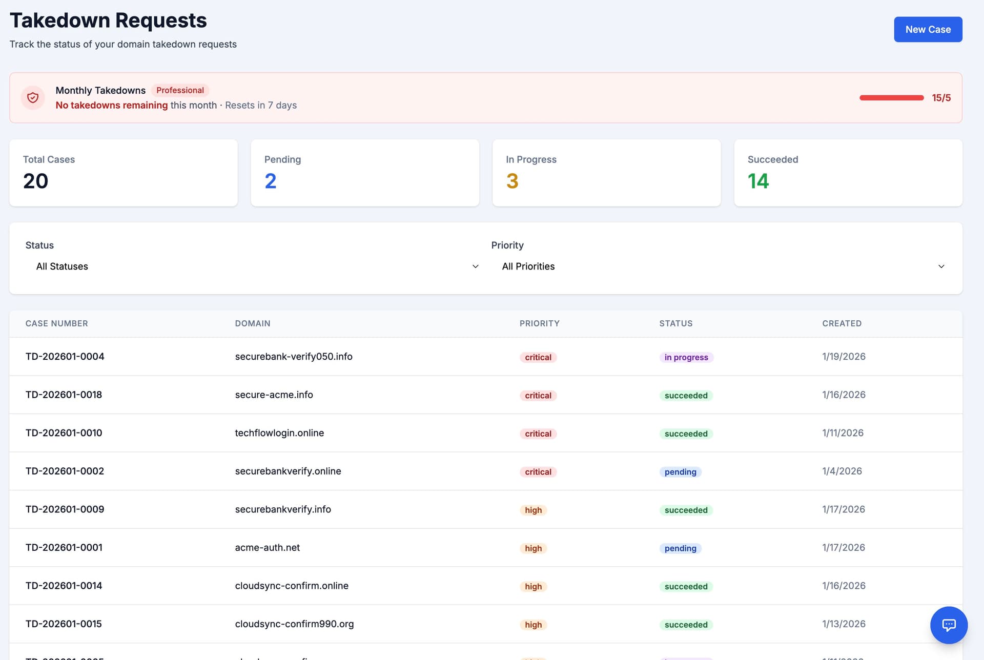 Track abuse reports, monitor registrar responses, and document case progress—all in one place. Never lose track of a takedown again.